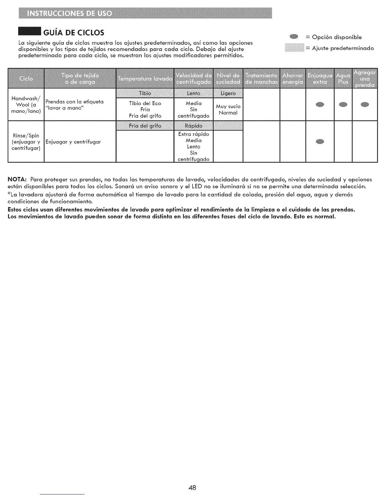 La siguiente guia de ciclos muestra los ajustes predeterminados, asi coma ias opciones