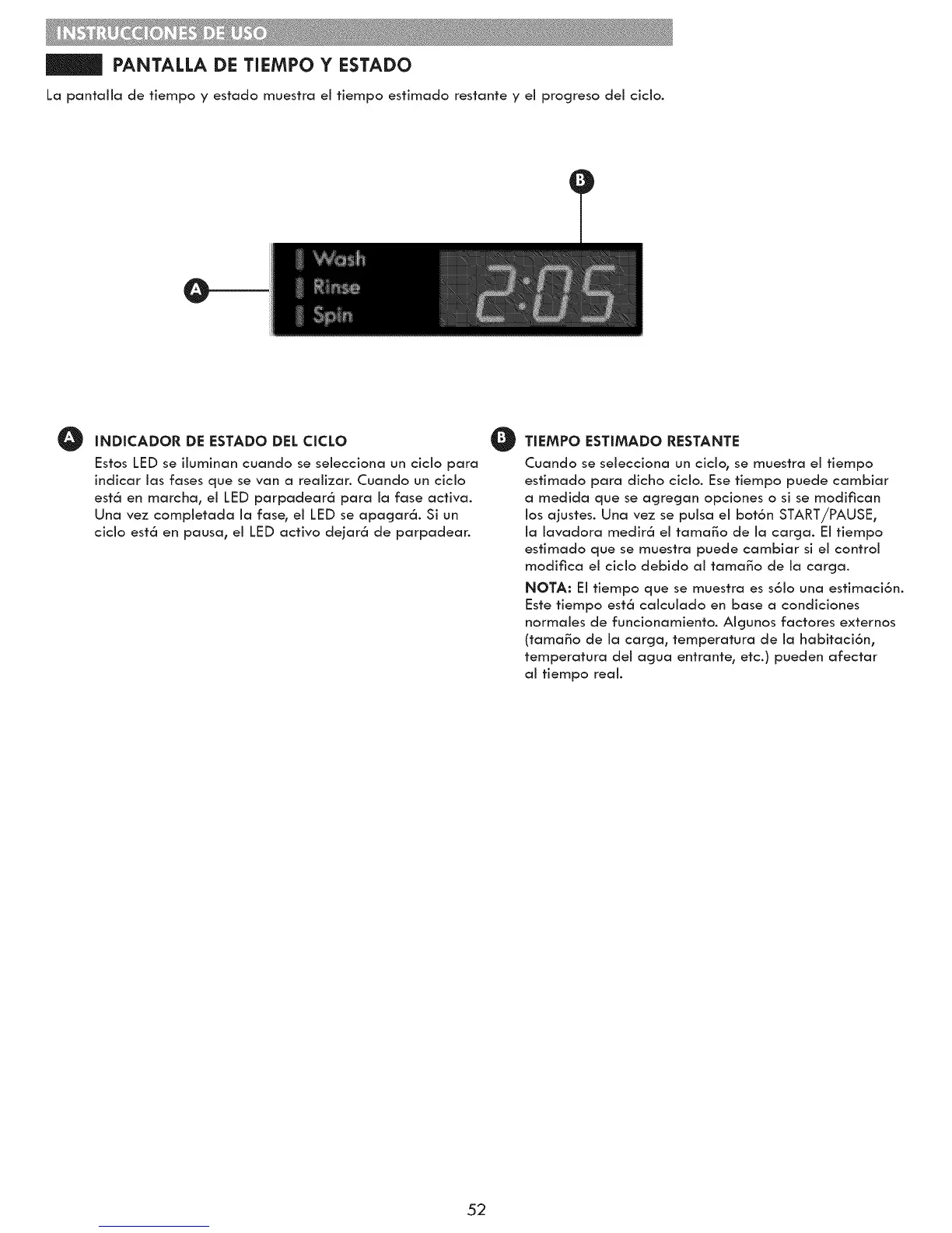 La pantalla de tiempo y estado muestra el tiempo estimado restante y el progreso del cicio.