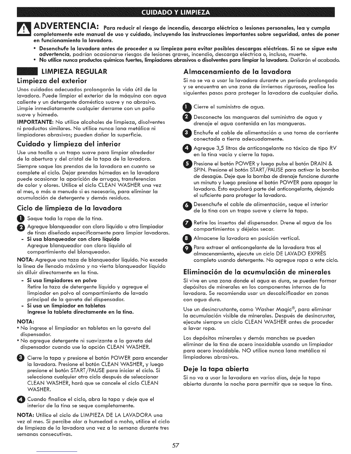 • No ufilice nunca productos qu_mlcos fuertes, limpladares abraslvos o dlsolventes para llmplar la lavadara. Da_ar6n el acabado.