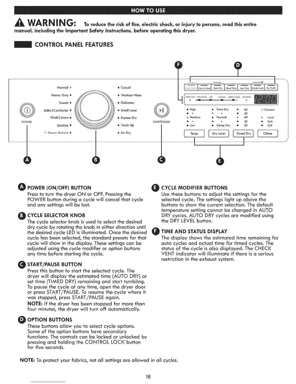 Pressto turn the dryer ON or OFF. Pressing the