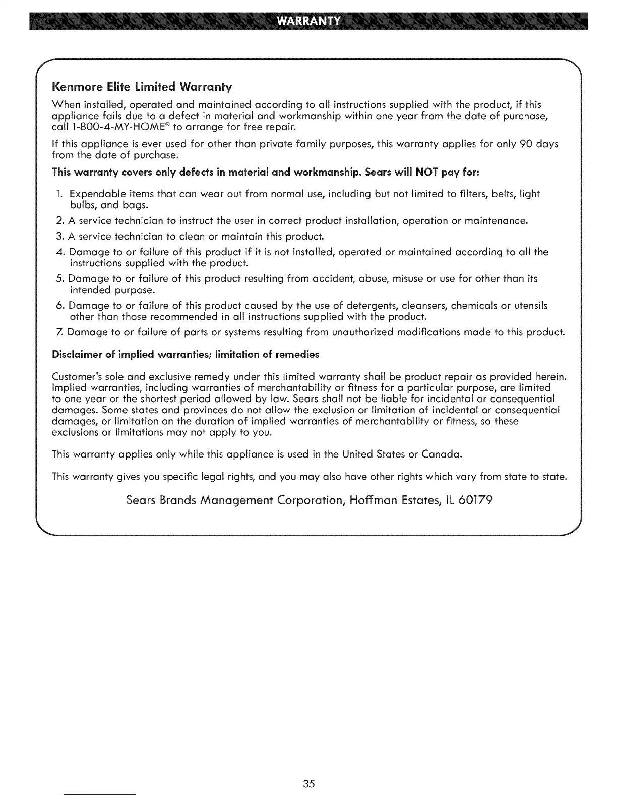 Kenmore Elite Limited Warranty