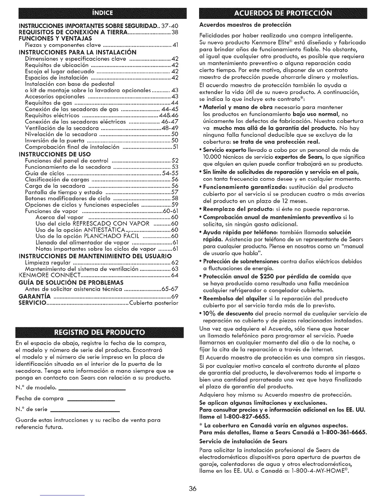 Conexi6n de las secadoras el_ctricas .................... 46-47