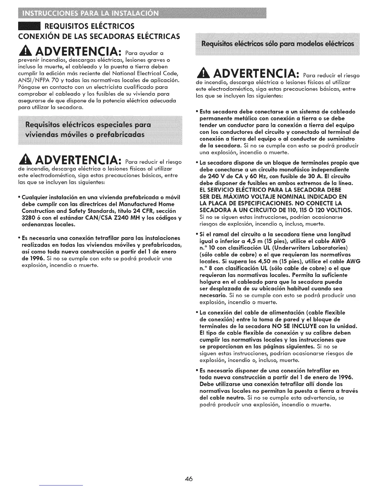 ANSI/NFPA 70 y todos los normotivos locales de oplicoci6n.
