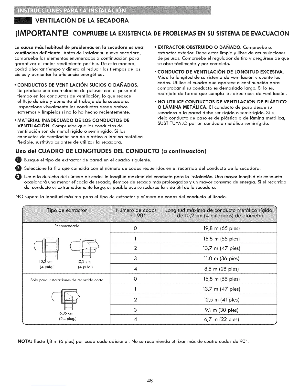 NOTA: Reste 1,8 m (6 pies) por cada codo adicionai. No se recomienda utiiizar m6s de cuatro codos de 90 °.