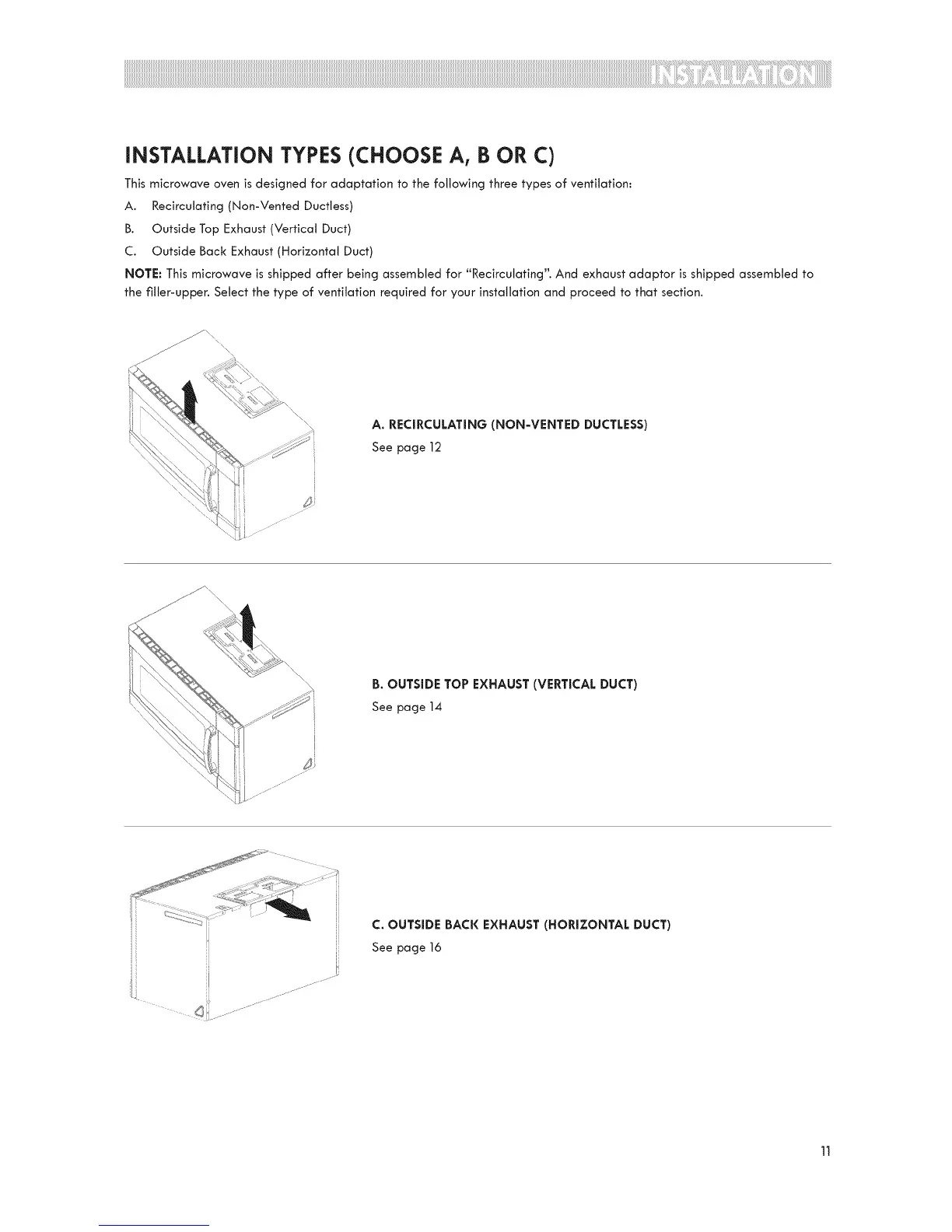 This microwave oven is designed for adaptation to the following three types of ventilation: