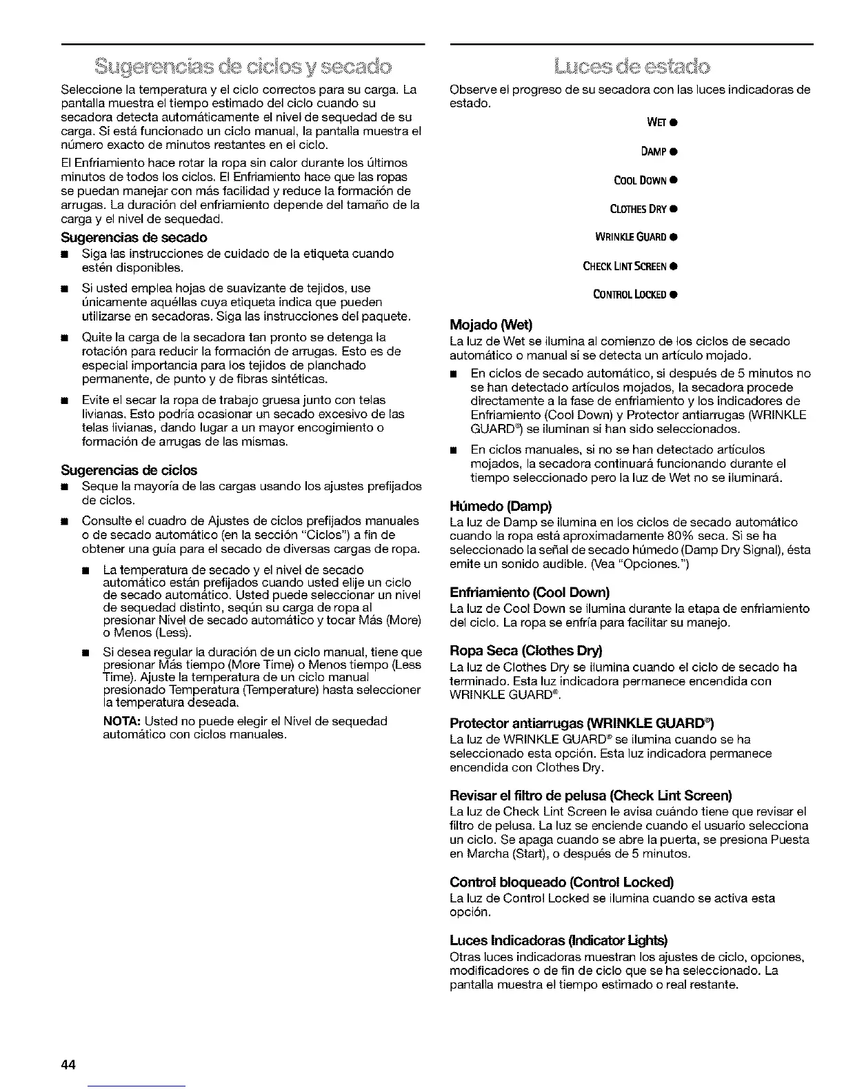 Observe el progreso de su secadora con las luces indicadoras de