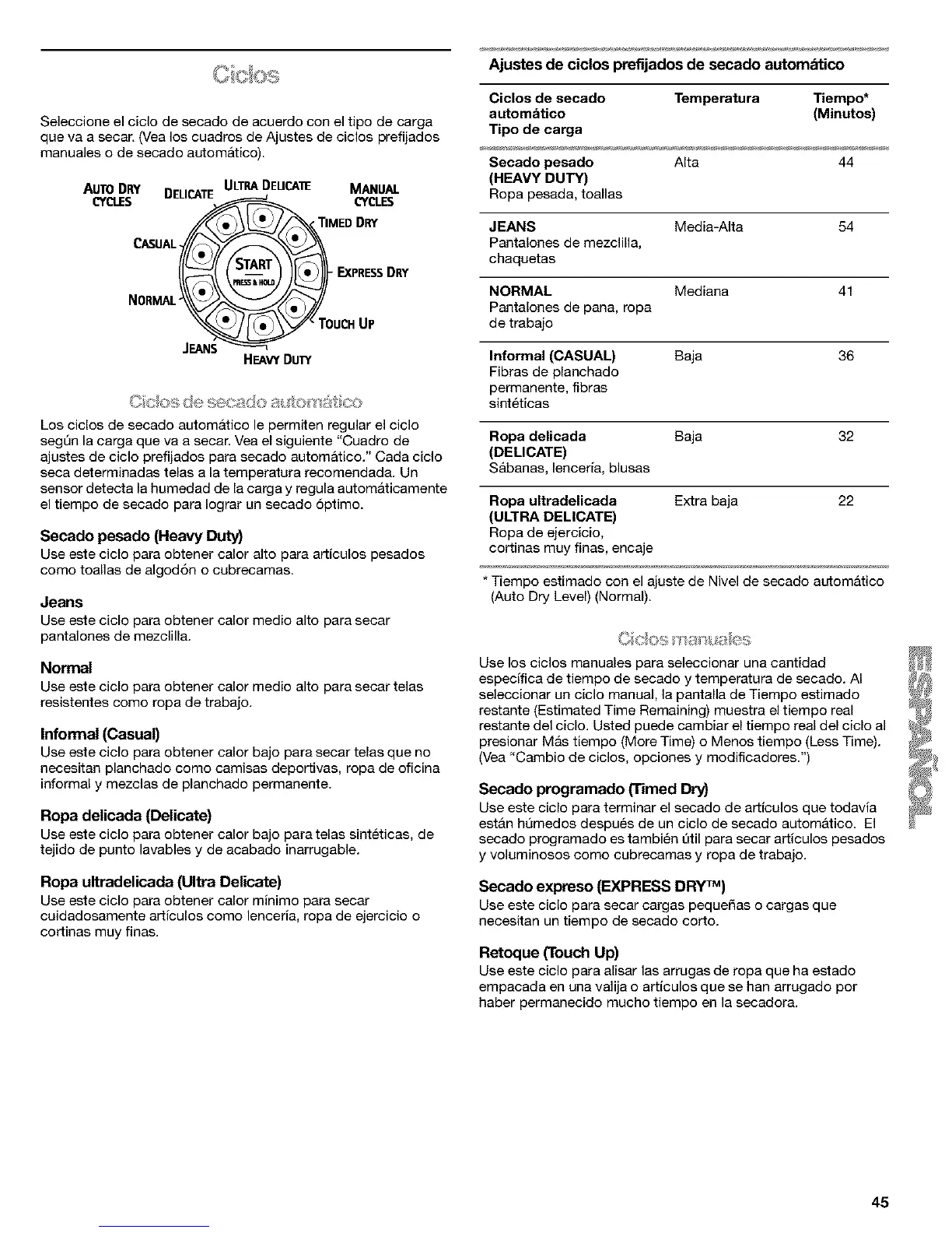 ajustes de ciclo prefijados para secado autom&tico." Cada ciclo