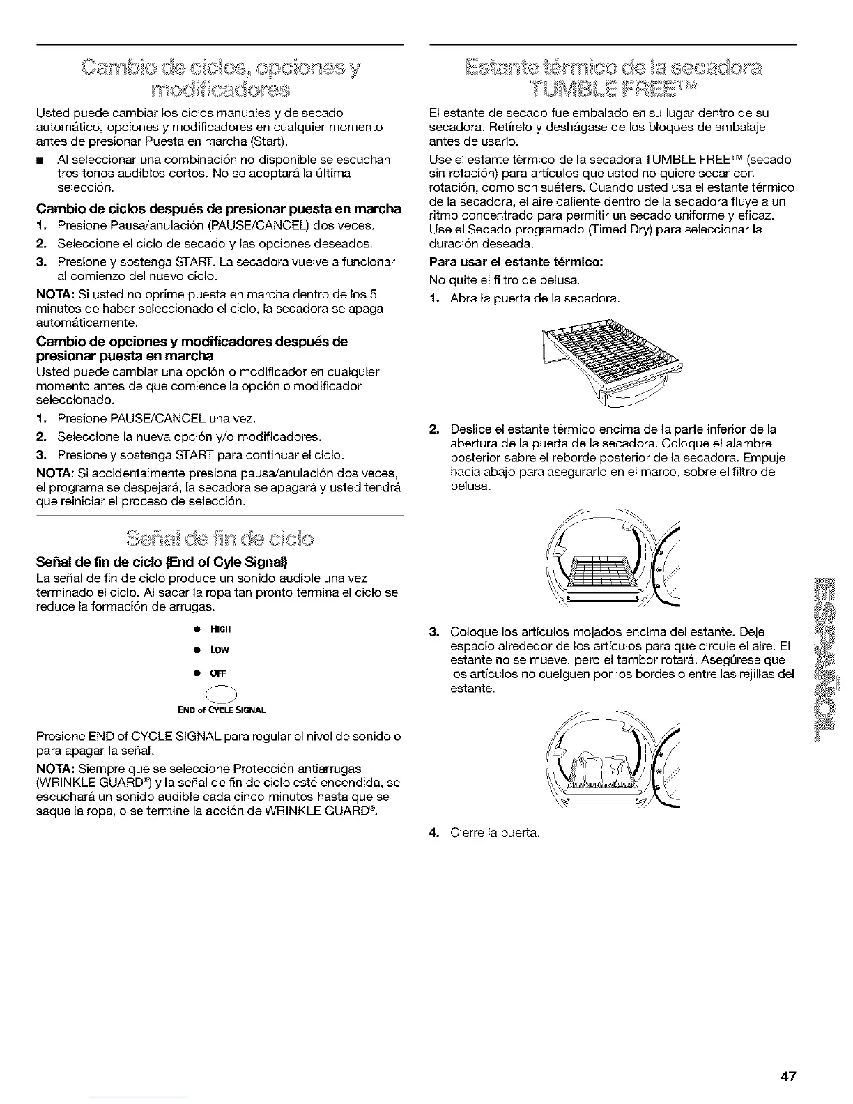 Use el estante termico de ia secadora TUMBLE FREETM (secado