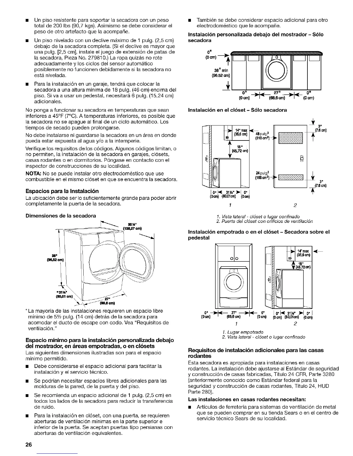 secadora a una altura minima de 18 pulg. (46 cm) encima del