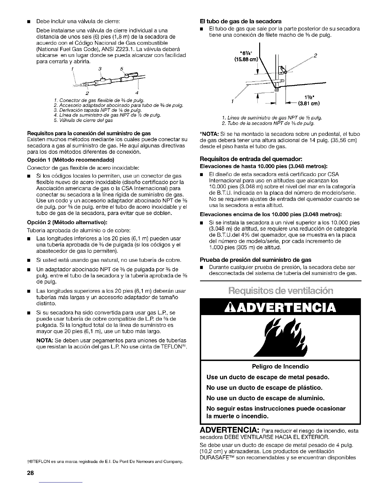 pulg. entre el tubo de la secadora y la tuberia aprobada de 3/8