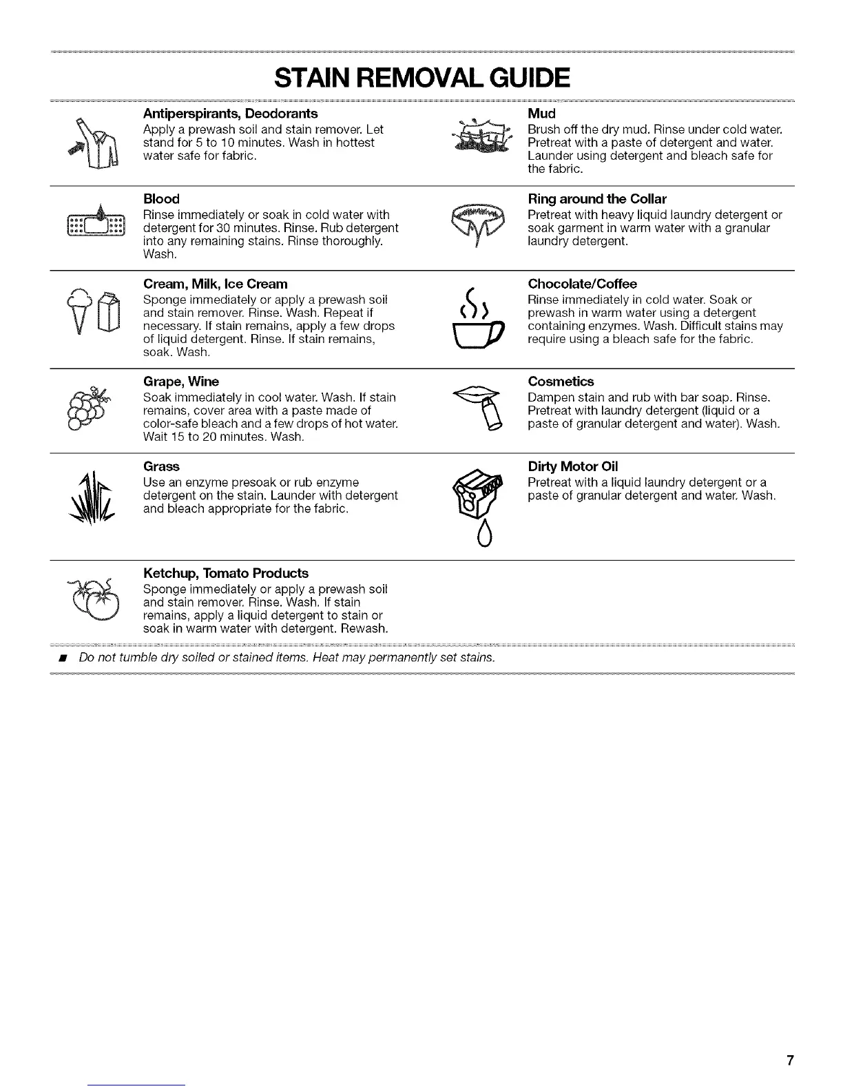 • Do not tumble dry soiled or stained items. Heat may permanently set stains.