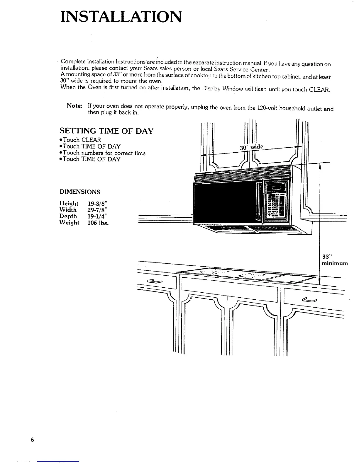 A mounting space of 33" or more from the surface of cooktop to the bottom of kitchen top cabinet, and at least