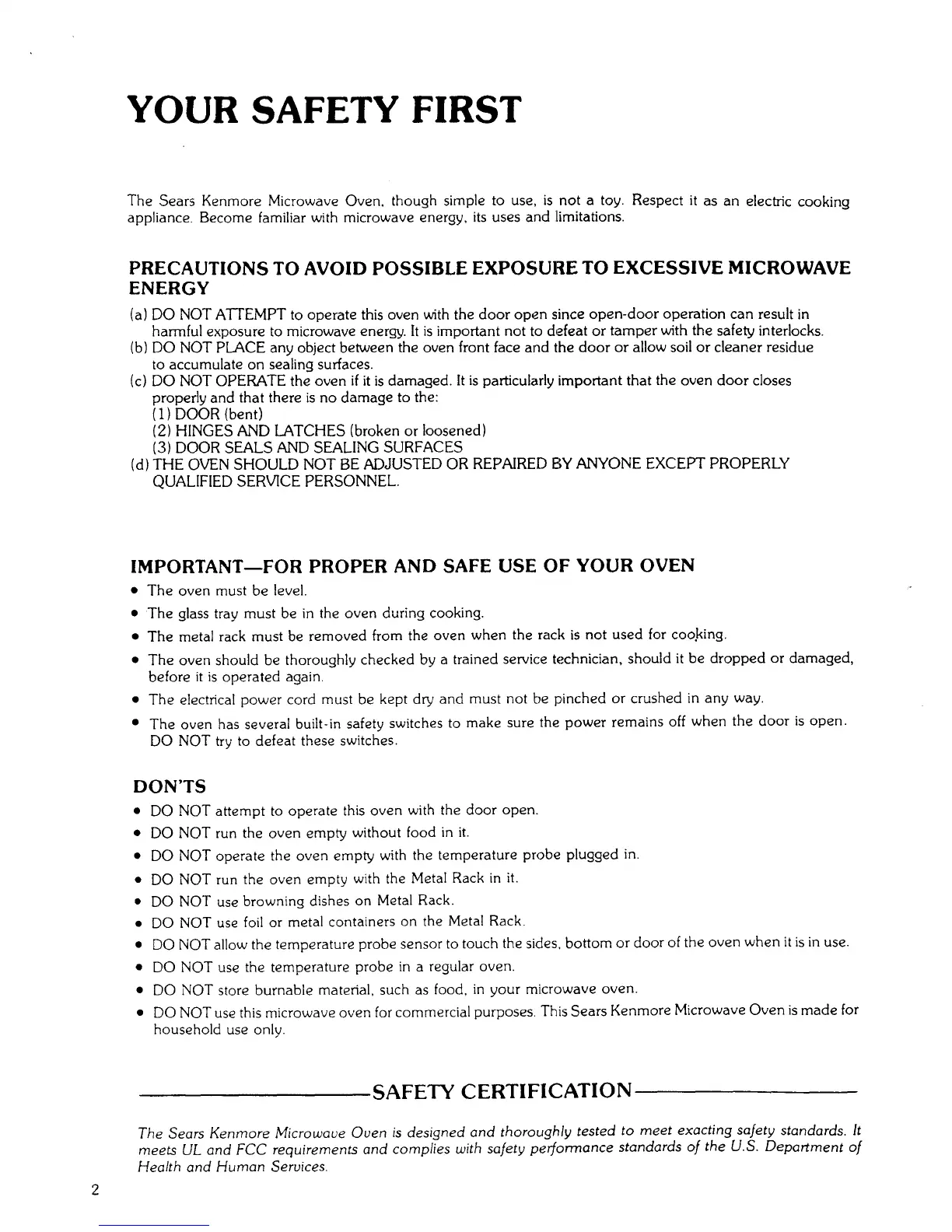 The Sears Kenrnore Microwave Oven is designed and thoroughly tested to meet exacting safety standards. It