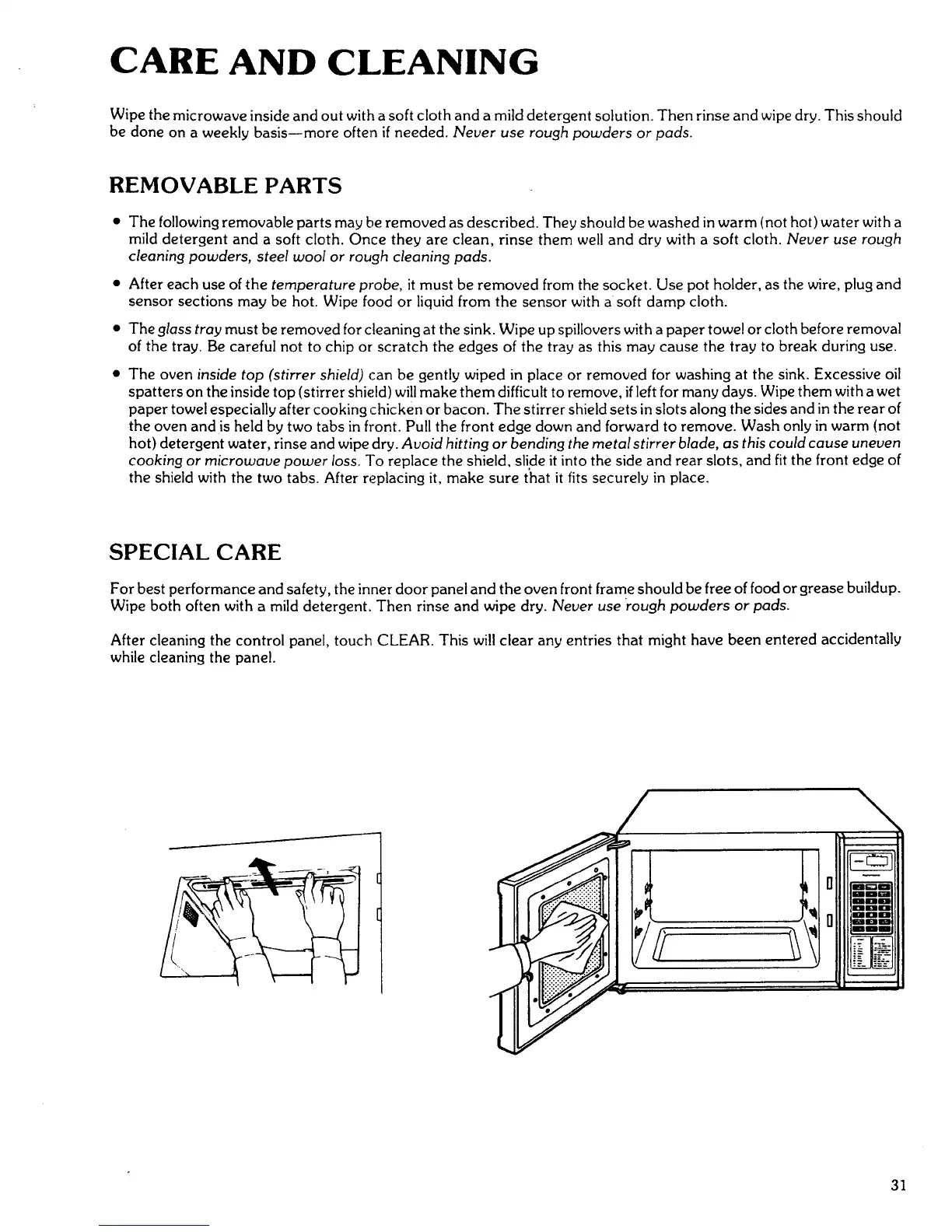 The glass tray must be removed for cleaning at the sink. Wipe up spillovers with a paper towel or cloth before removal