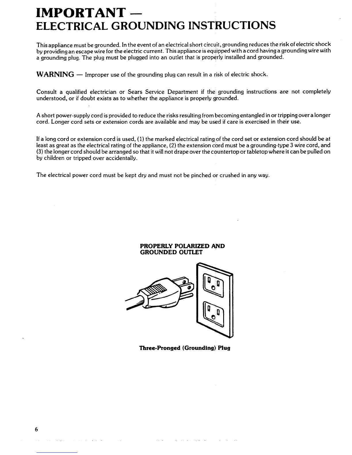 Consult a qualified electrician or Sears Service Department if the grounding instructions are not completely