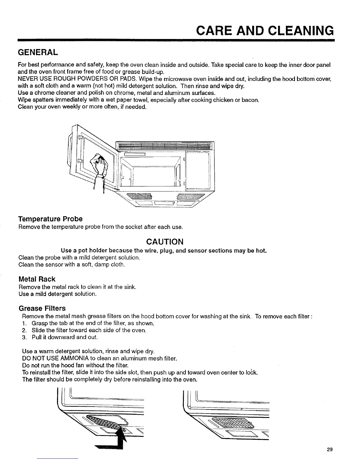 NEVER USE ROUGH POWDERS OR PADS. Wipe the microwave oven inside and out, including the hood bottom cover,