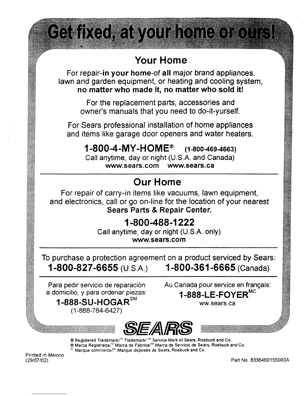 ® Marca Registrada/TMMarca de Fabrica/S"Marca de Servicio de Sears, Roebuck and Co.