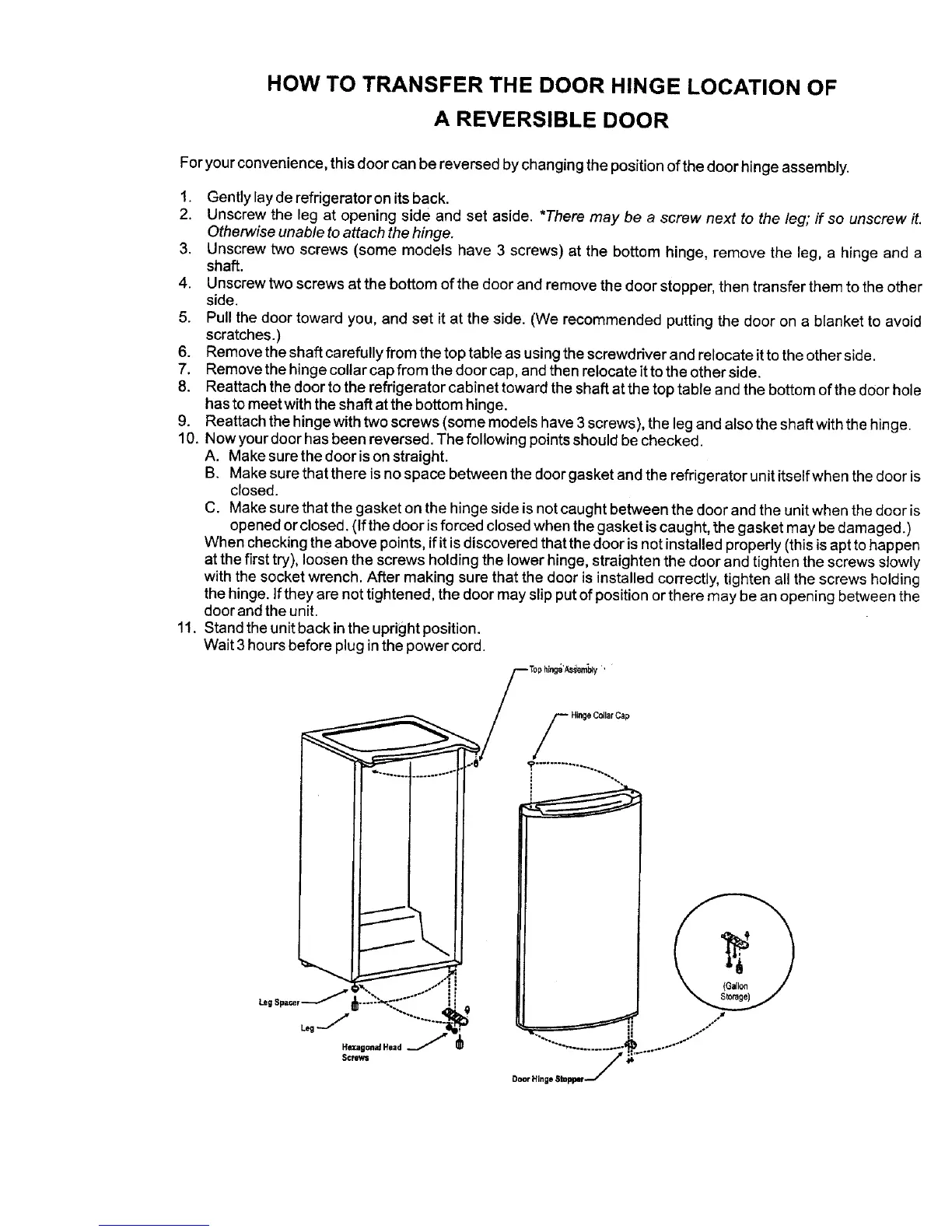 For your convenience, this door can be reversed by changing the position of the door hinge assembly.