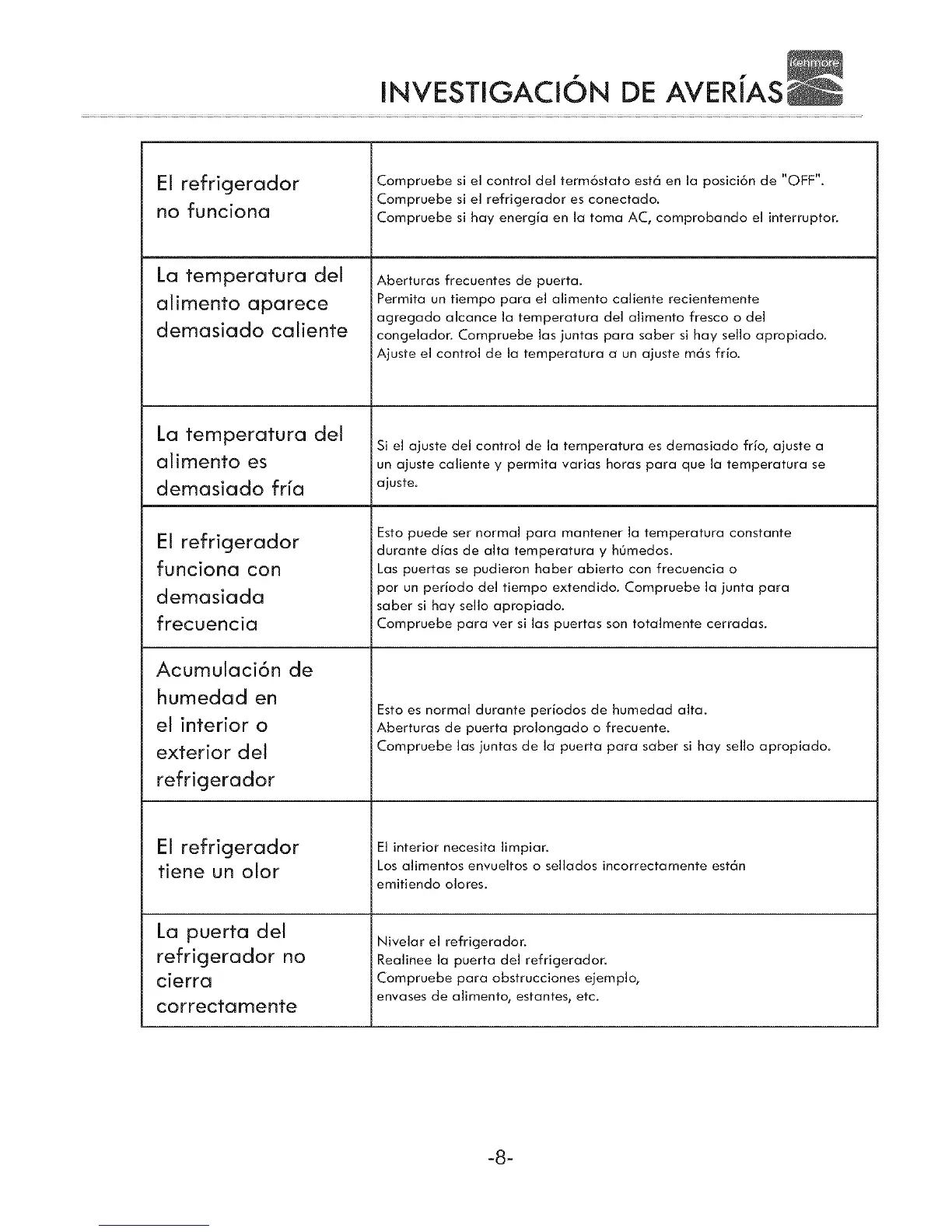 i congelador. Compruebe las juntas para saber si hay sello apropiado.