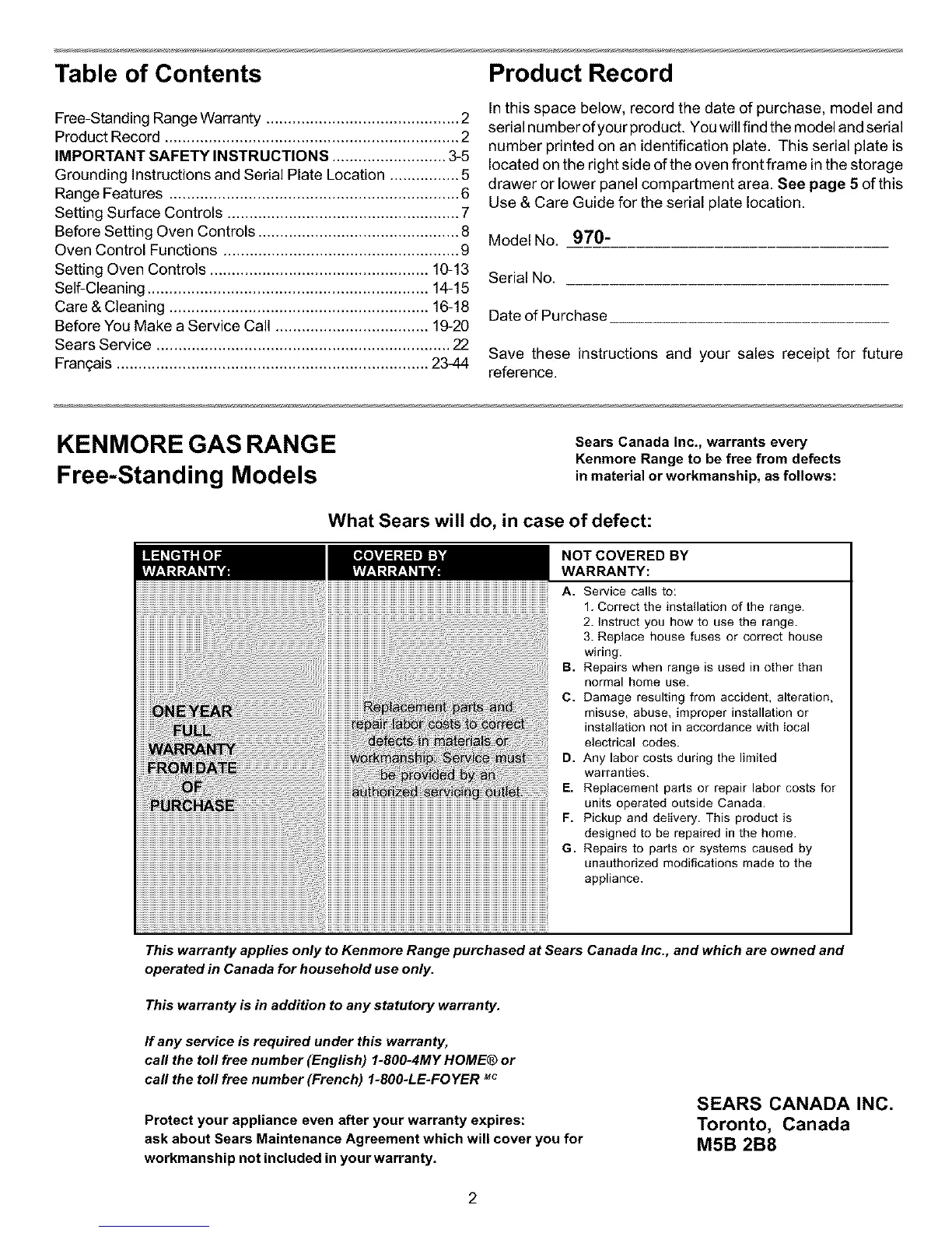 Free-Standing Range Warranty ............................................ 2