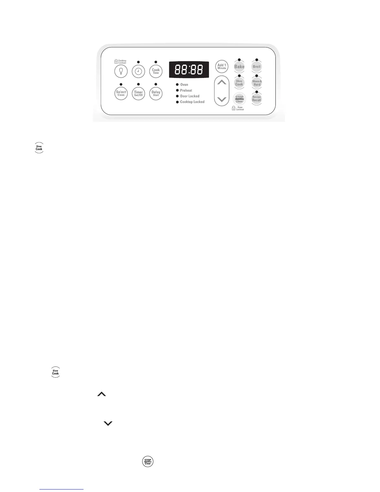 The SLOW COOK pad is used to activate this feature. The Slow Cook feature may be used to cook foods more slowly,