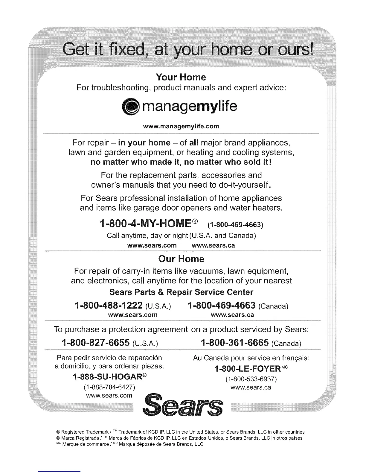 ® Registered Trademark / TMTrademark of KCD IP, LLC in the United States, or Sears Brands, LLC in other countries