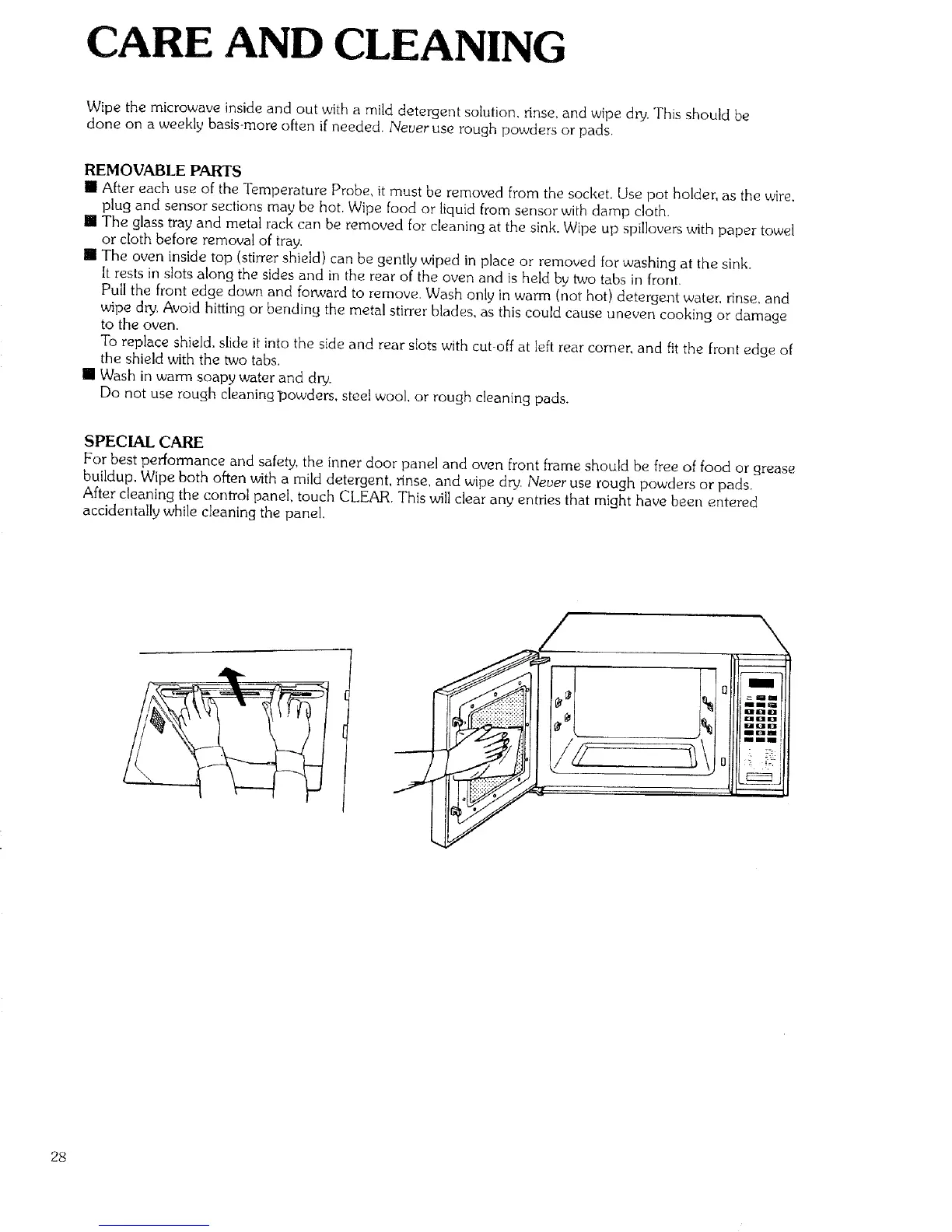 [] The oven inside top (stirrer shield) can be gently wiped in place or removed for washing at the sink.