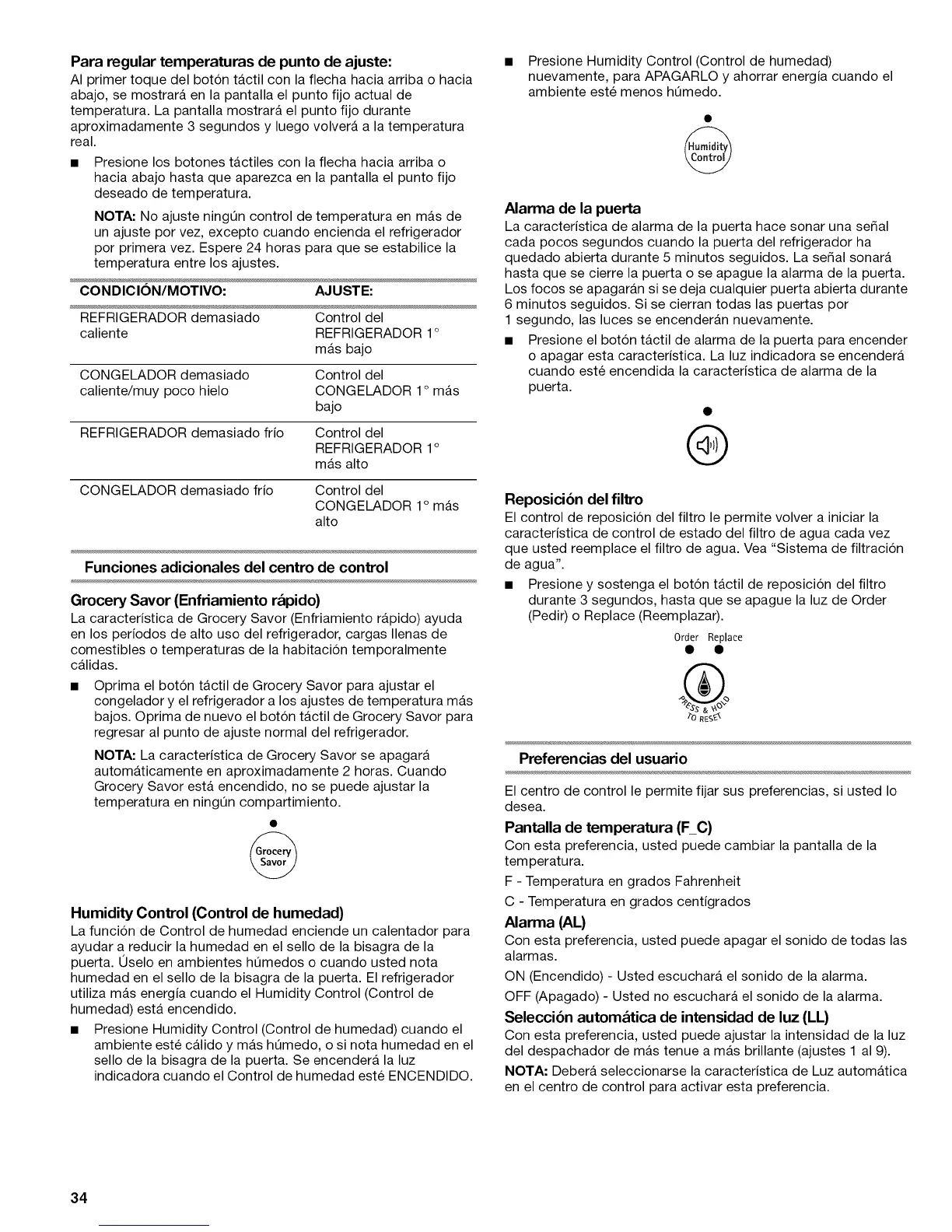 • Oprima el boton tactil de Grocery Savor para ajustar el