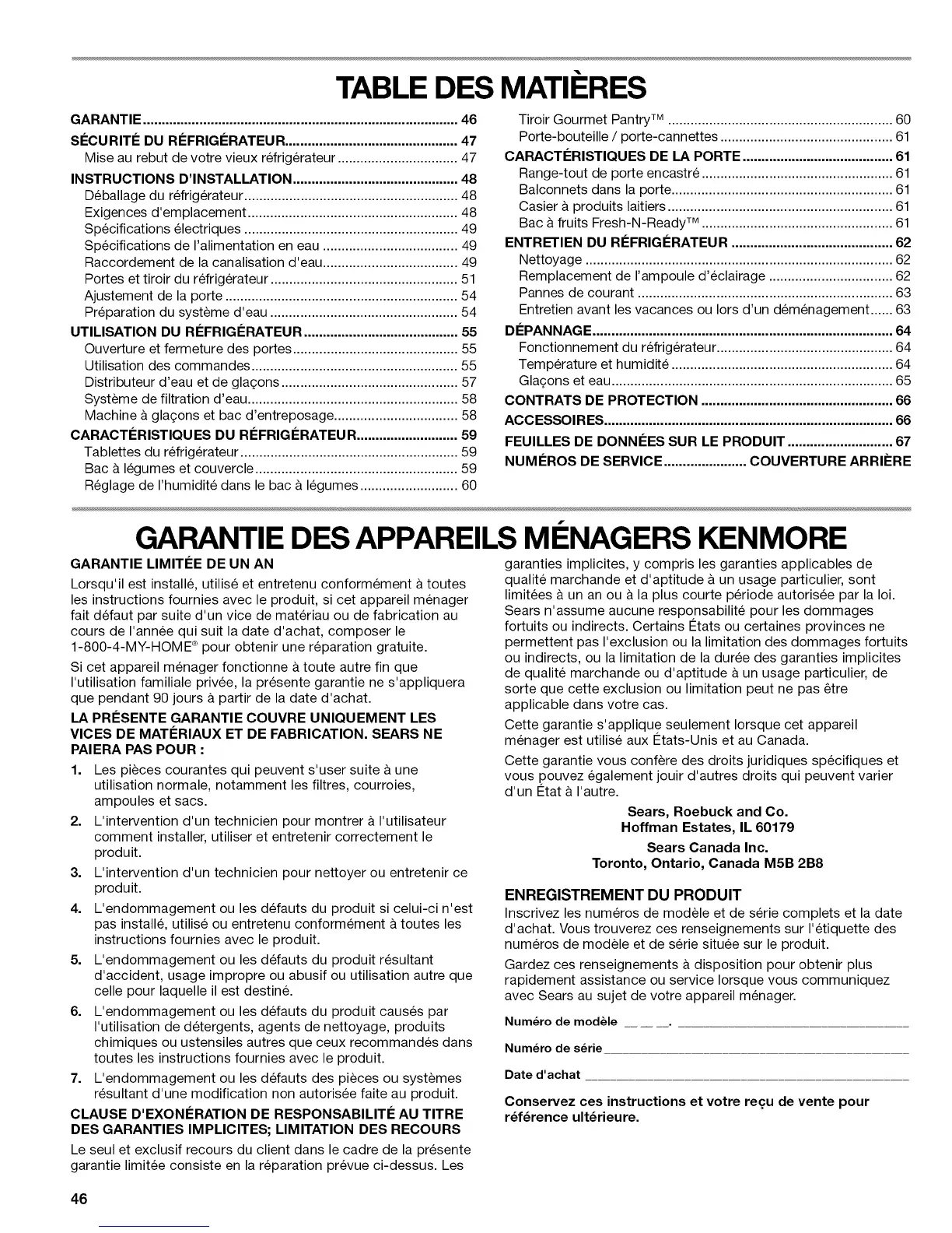 GARANTIE DES APPAREILS MI NAGERS KENMORE