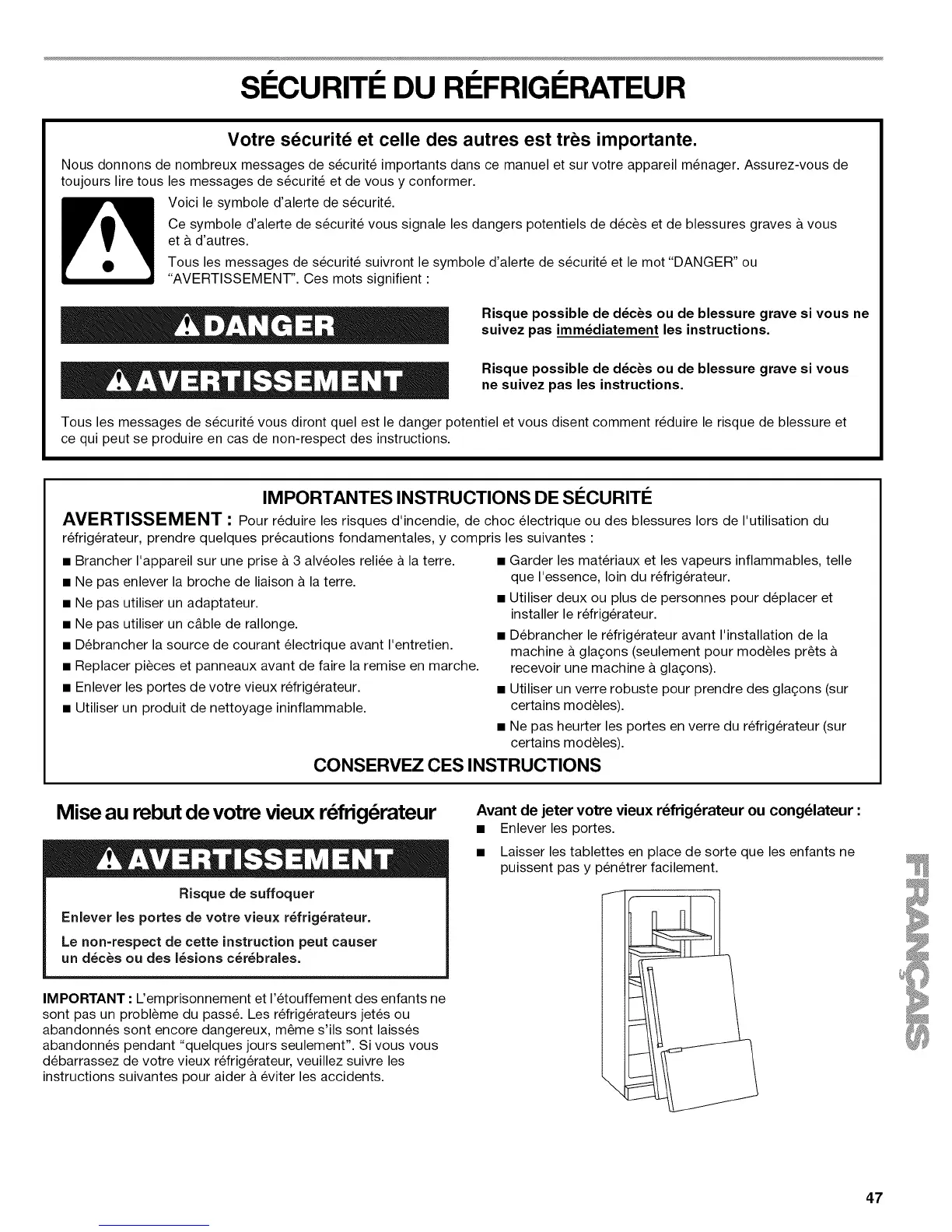 Nous donnons de nombreux messages de s_curit_ importants dans ce manuel et sur votre appareil m_nager. Assurez-vous de