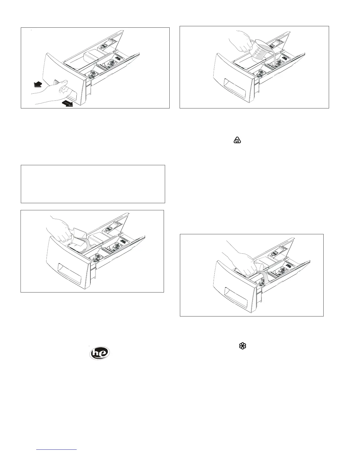 5. Verser le détergent, le javellisant et l’assouplisseur de tissu dans le distributeur automatique en respectant les étapes