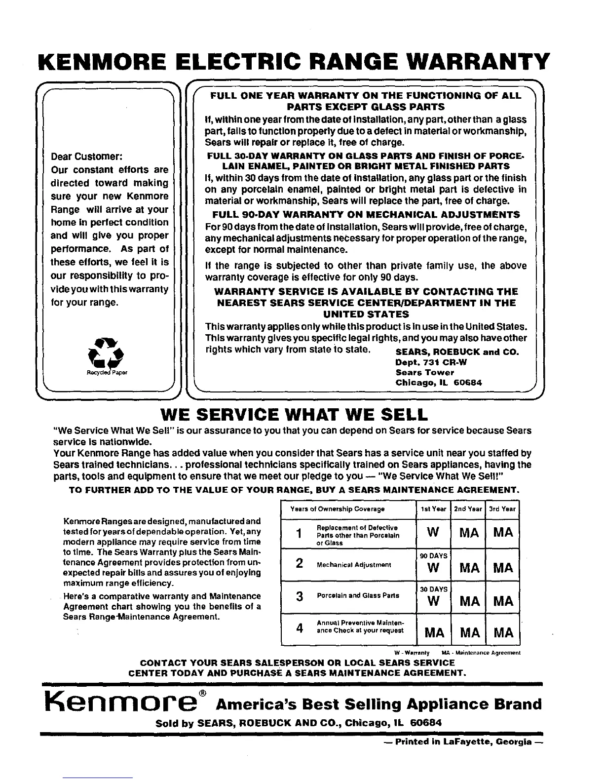 Sears RangeMaintenance Agreement.