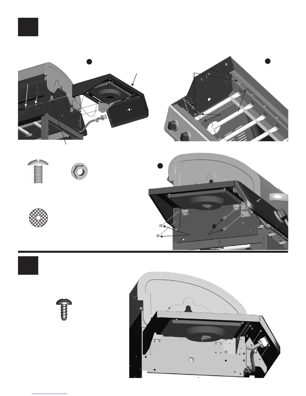 • Inside firebox, insert (3) 7mm fiber washers and (3) 1/4-20x1/2” screws as shown (B).