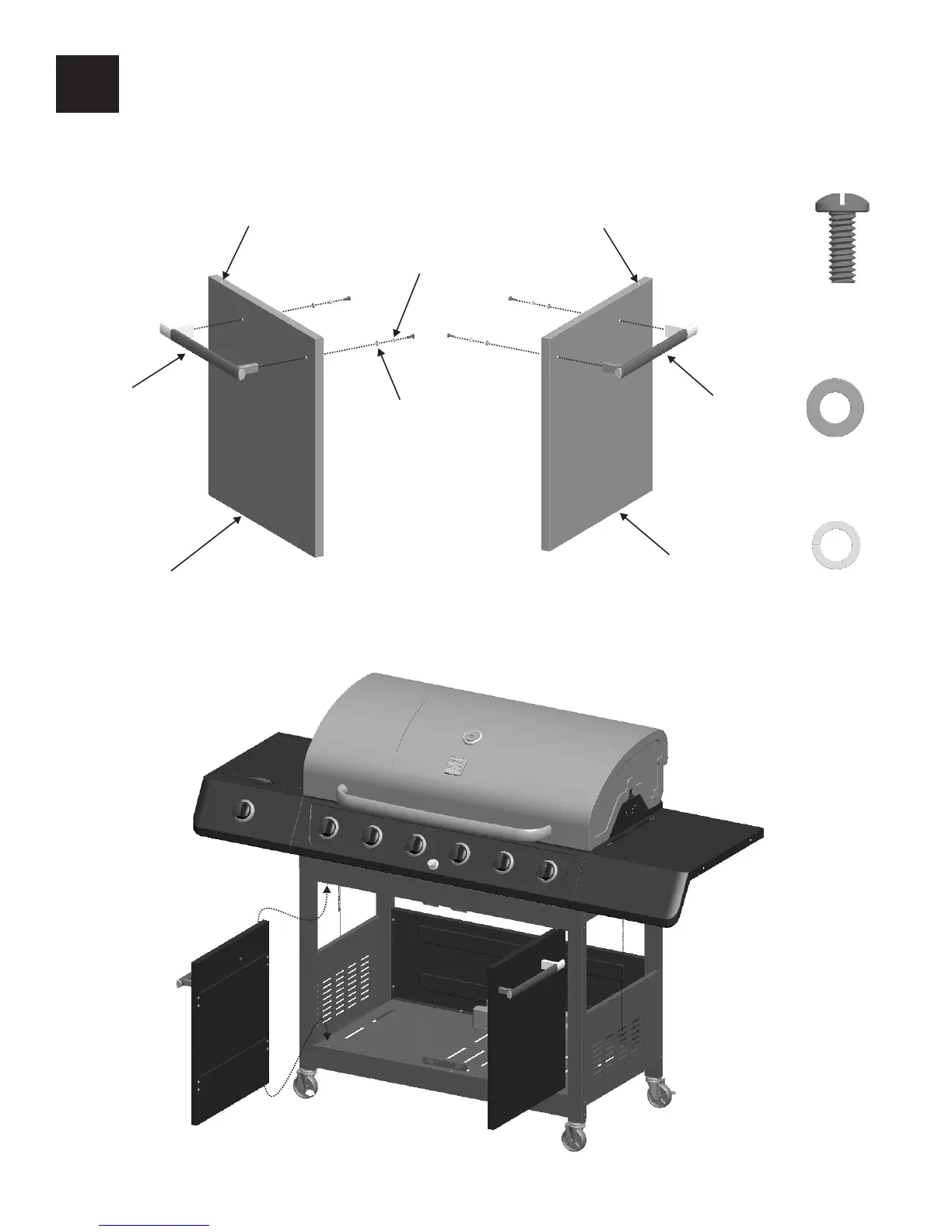 Attach handle to door with #10-24x1/2” machine screws, 5mm flat washers and 5mm lock washers (A).