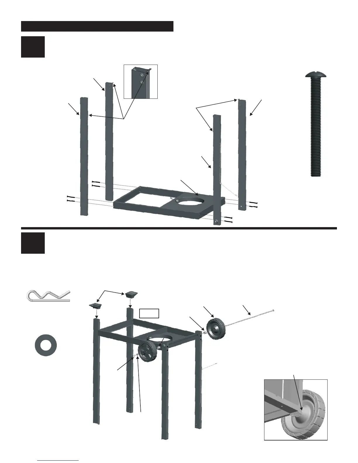 □ From front side of cart, insert axle rod through wheel, wheel spacer, right legs, another wheel spacer