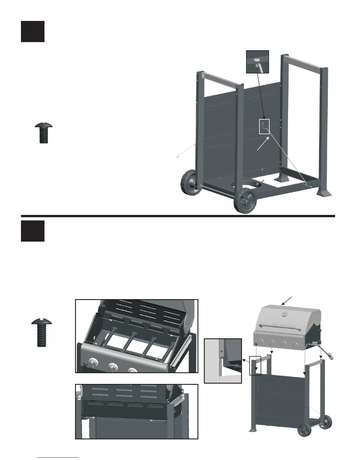 □ Use two 1/4-20x1/2" machine screws to attach grill head to the two rear legs as shown (C).