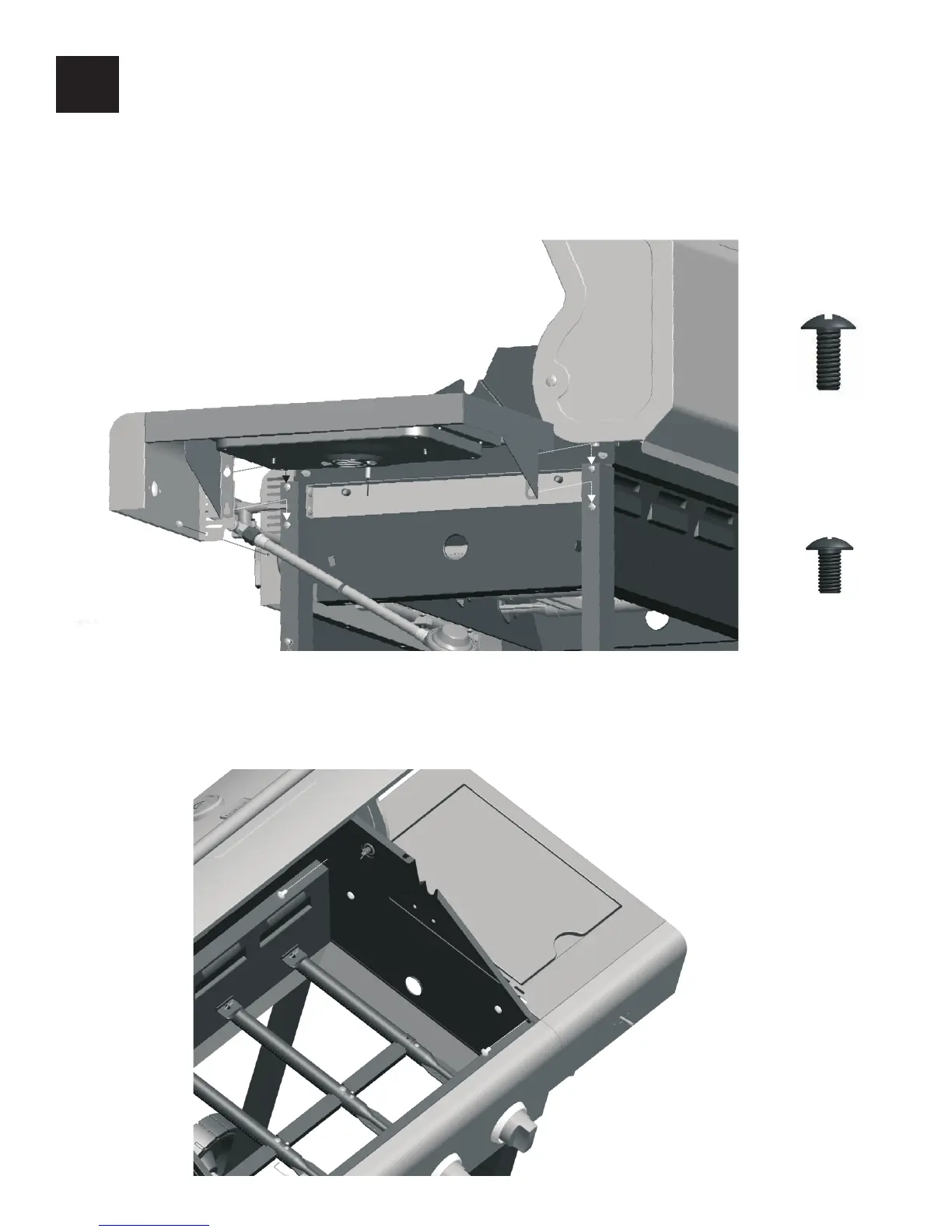 □ Use two 1/4-20x1/2" machine screws to attach side burner shelf to firebox as shown (B).