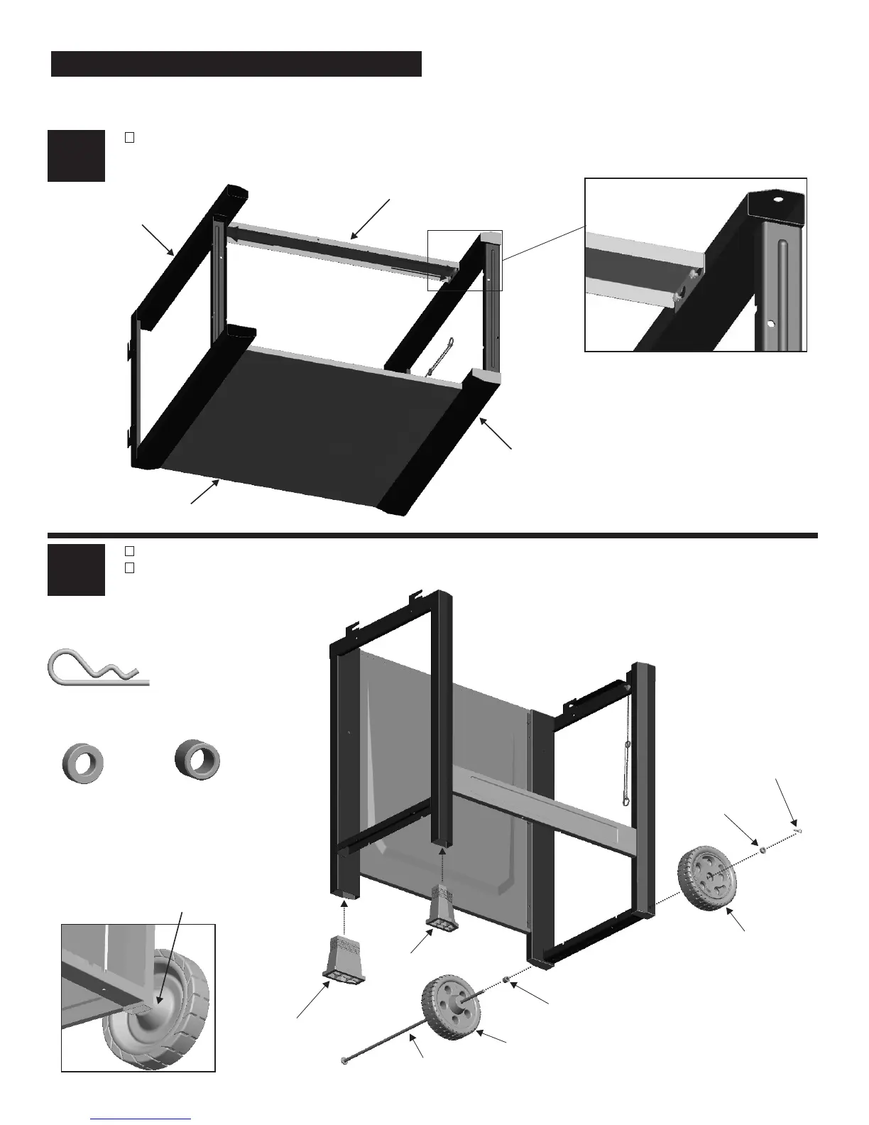 Insert axle rod through wheel, front wheel bushing, legs other Attach with (1) axle spacer and hitch pin.