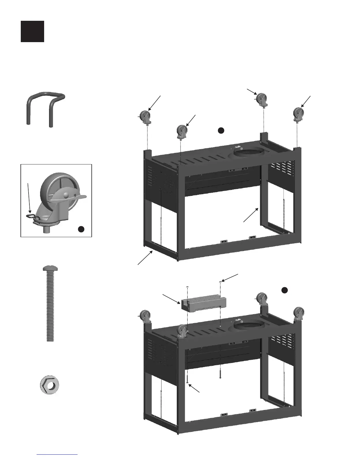 are secured at the rear and the non-locking casters are secured at the front (B). After all 4 casters are secure remove the