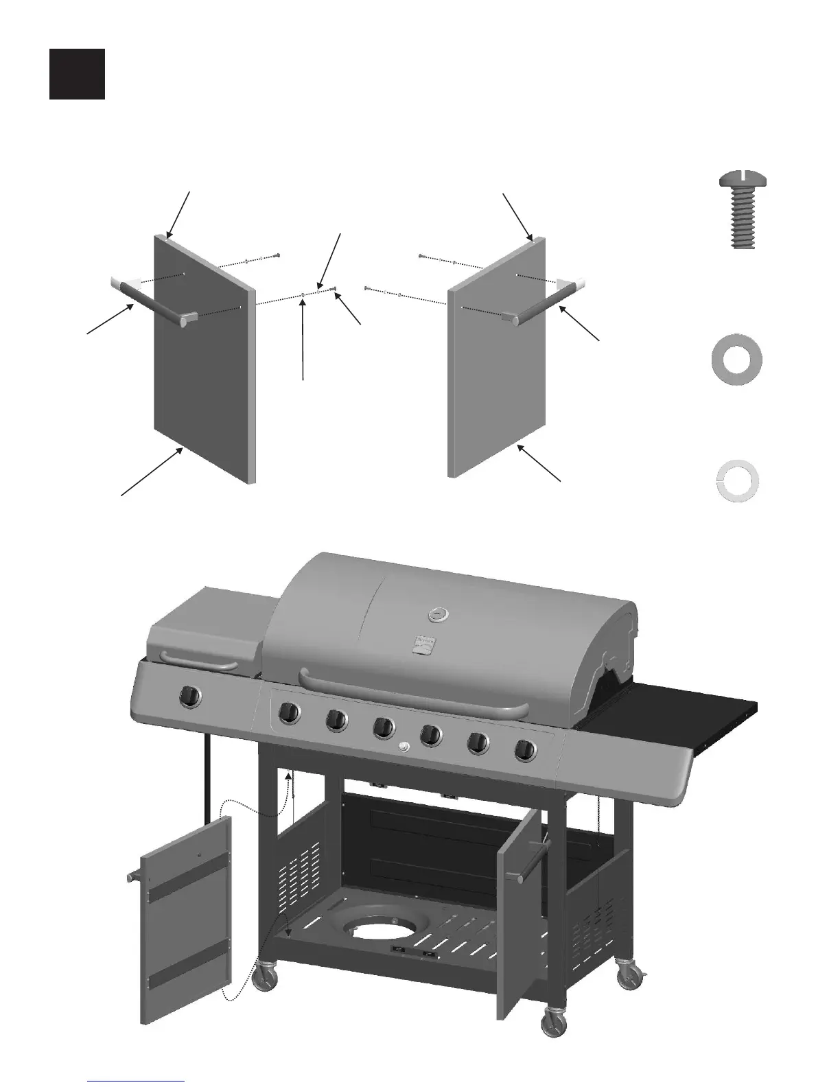Attach handle to door with #10-24x1/2” machine screws, 5mm flat washers and 5mm lock washers (A).