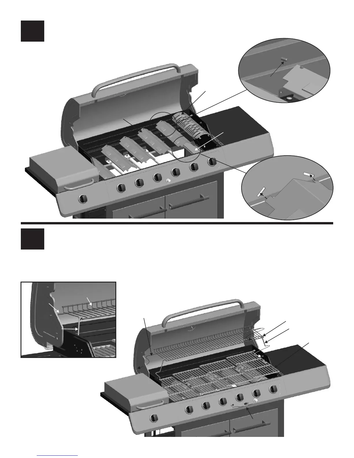 • Place heat diffusers over tube burners and the heat diffuser for sear burner over sear burner by inserting tabs into slots