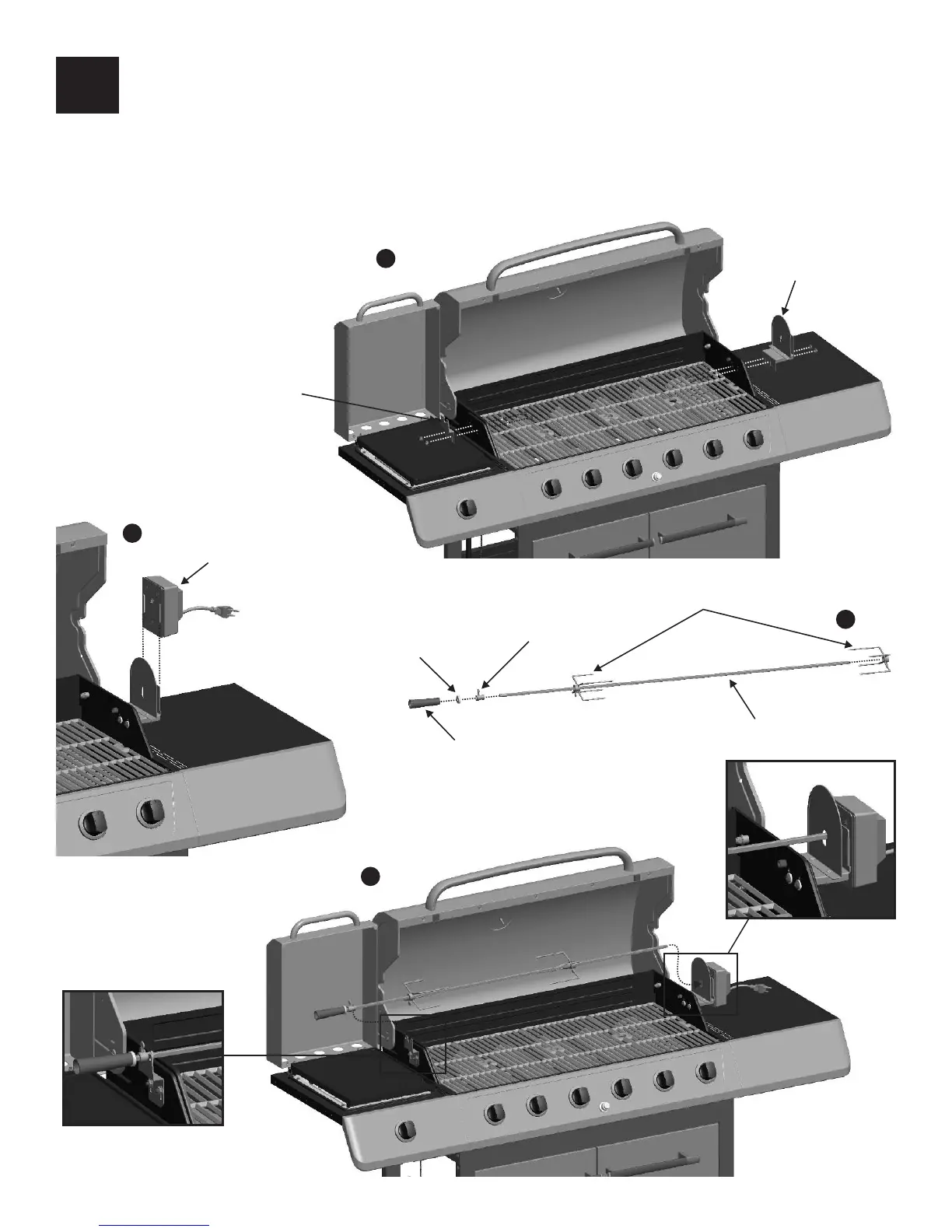 • Insert the motor end of the rotisserie into motor side rotisserie bracket. The handle end rest onto handle side rotisserie