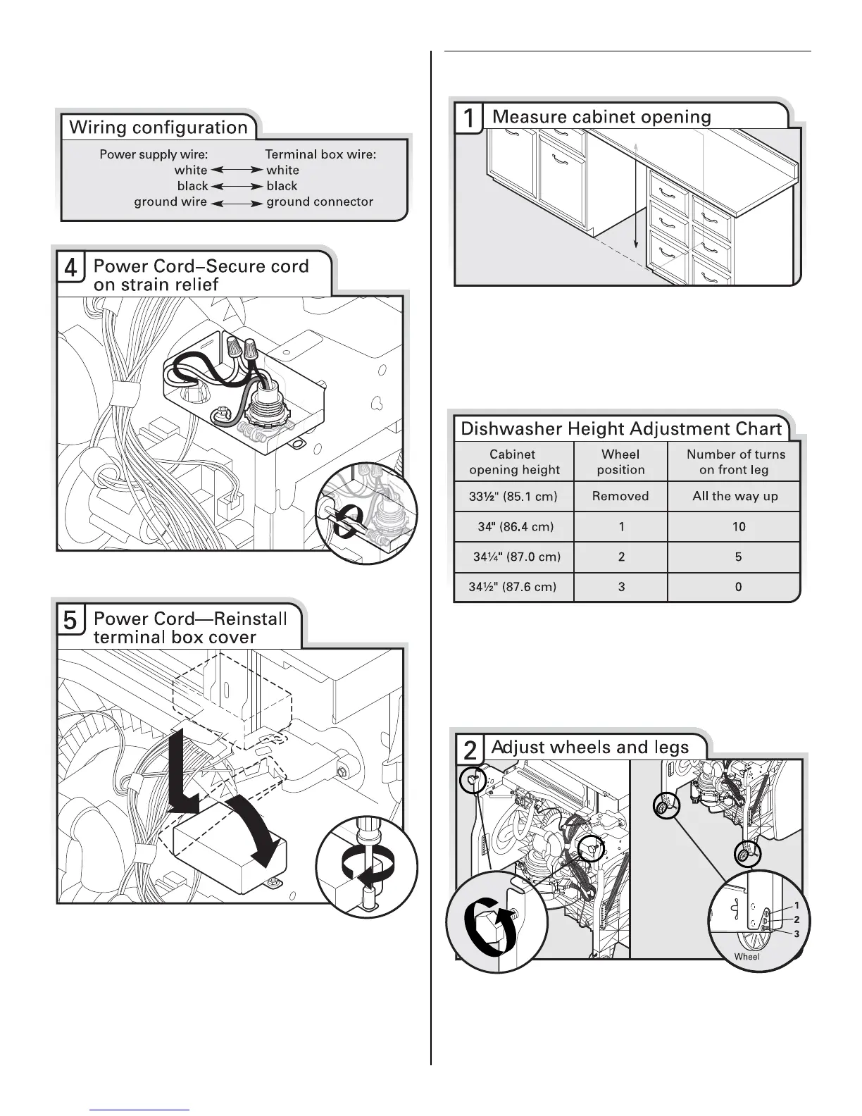 “Dishwasher Height Adjustment Chart” for wheel position and