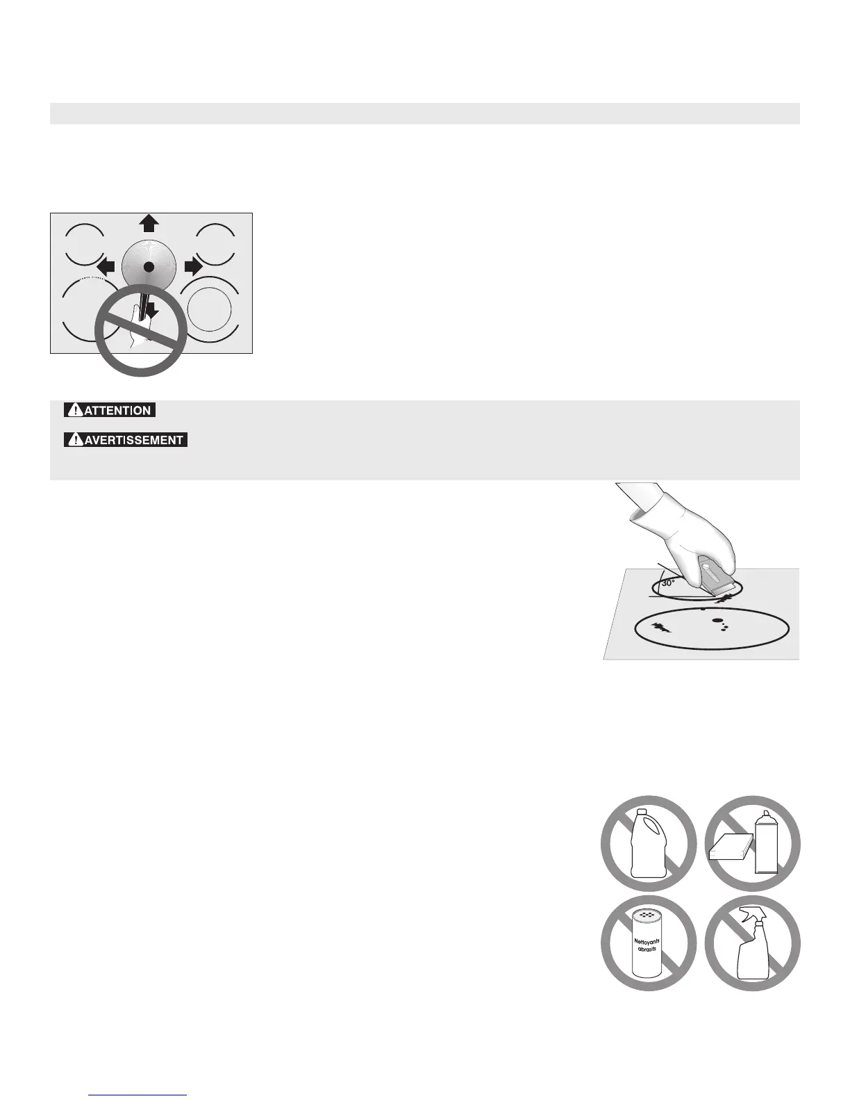 La surface de cuisson en vitrocéramique peut être endommagée par l’utilisation d’un tampon abrasif.