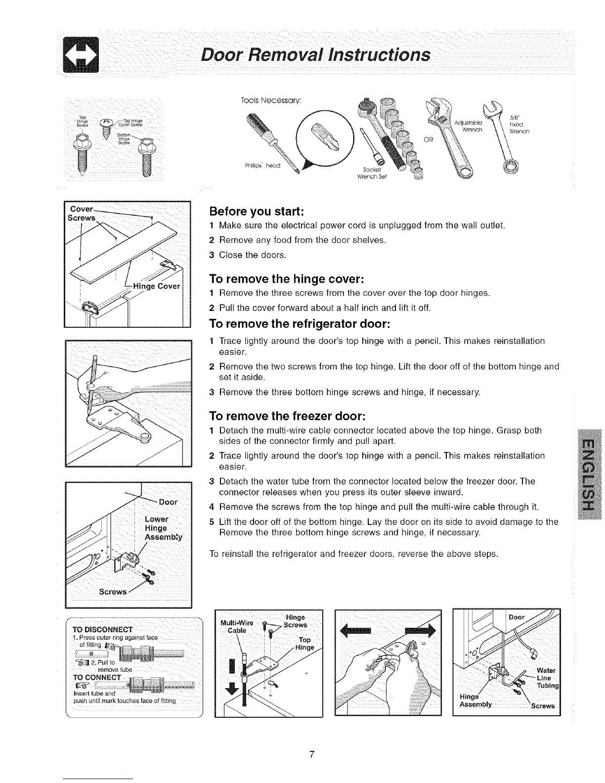 To reinstall the refrigerator and freezer doors, reverse the above steps.