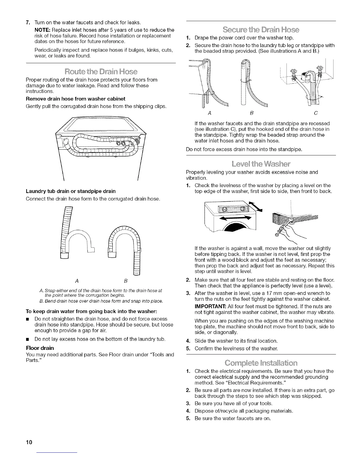 Kenmore Elite HE3 110.4789 Series - Route the Drain Hose; Secure the Drain Hose; Level the Washer; Complete Installation