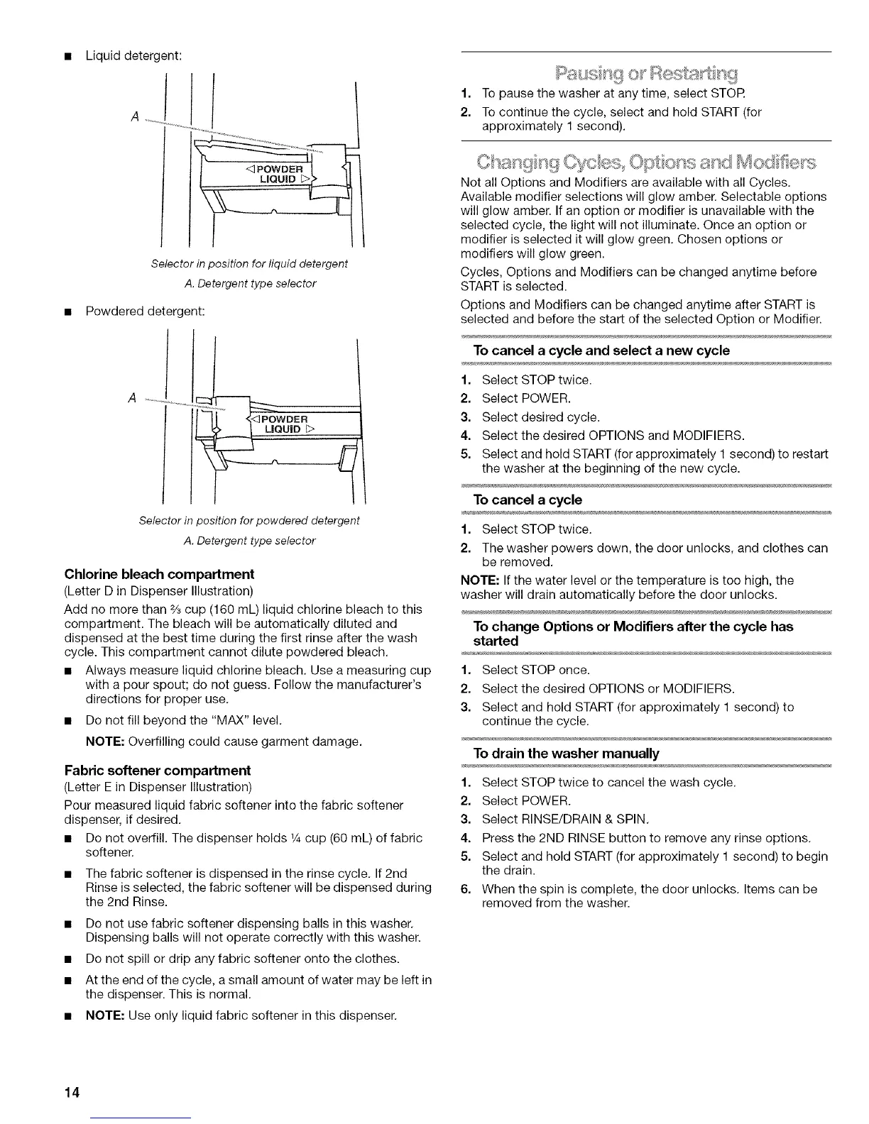 Kenmore Elite HE3 110.4789 Series - Pausing or Restarting; Changing Cycles, Options and Modifiers; Chlorine Bleach Compartment; Fabric Softener Compartment