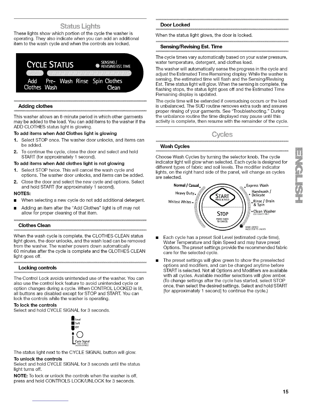 Kenmore Elite HE3 110.4789 Series - Status Lights; Wash Cycles
