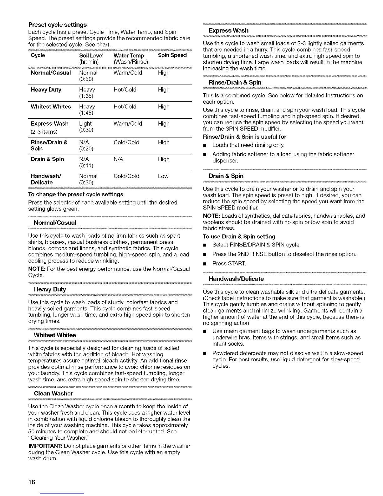 Kenmore Elite HE3 110.4789 Series - Preset Cycle Settings; Clean Washer; Rinse;Drain & Spin; Handwash;Delicate