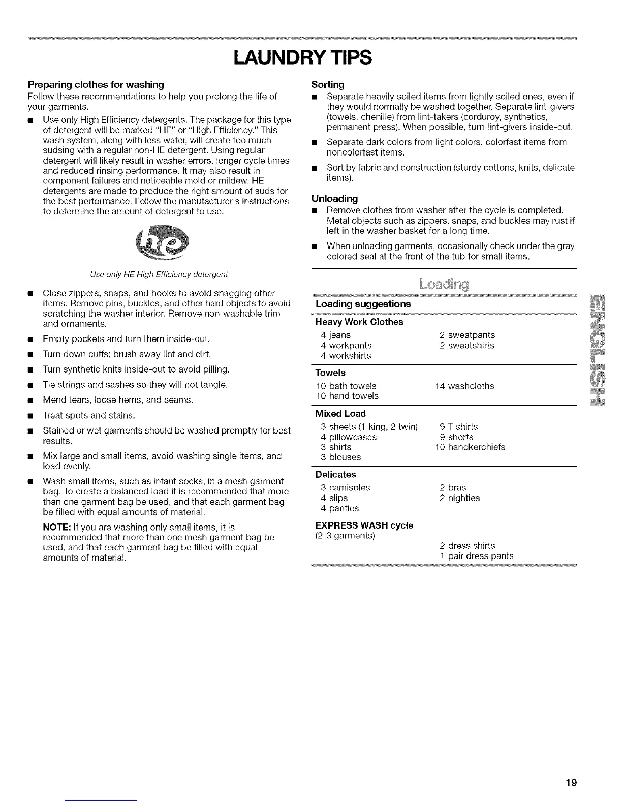 Kenmore Elite HE3 110.4789 Series - Laundry Tips; Preparing Clothes for Washing; Sorting; Loading